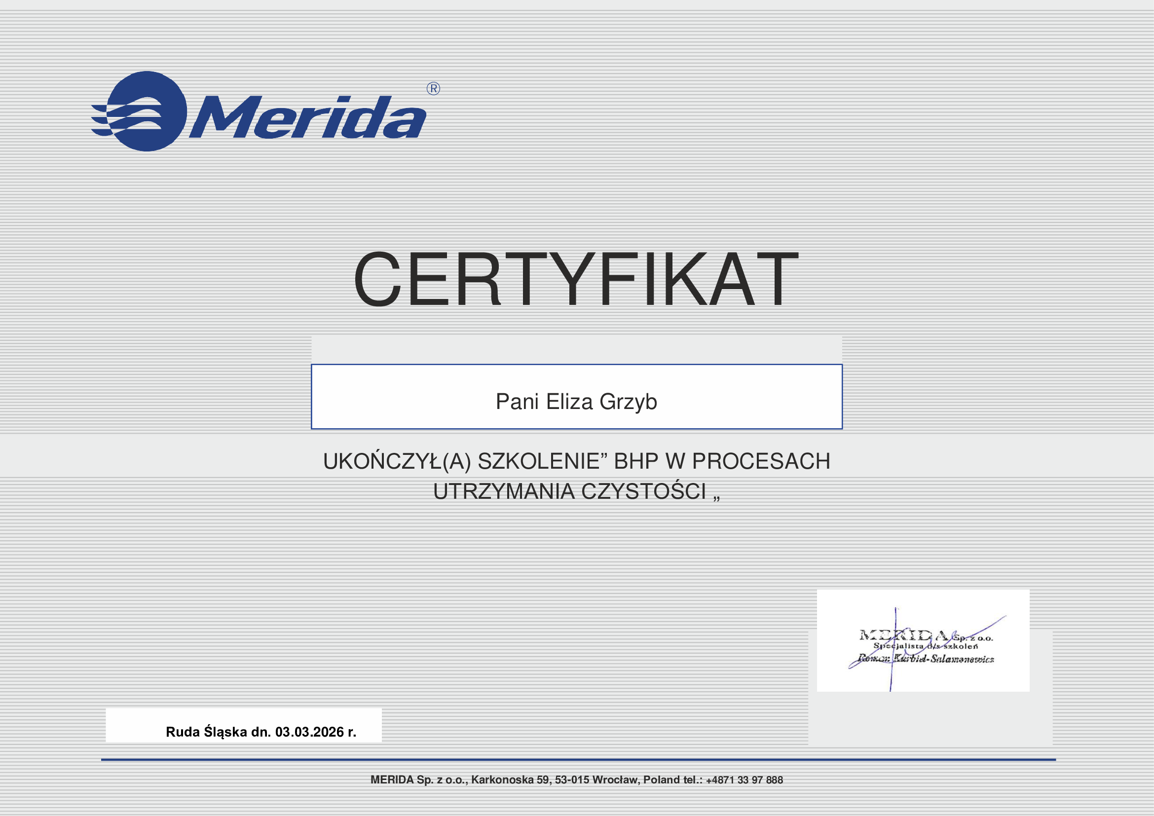 📸 Sprawdź naszą galerię certyfikatów i przekonaj się, że jakość w Harmony Cleaning to nie slogan, ale konkretny standard potwierdzony dokumentami.